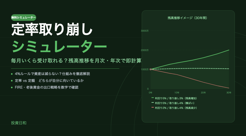 この記事でわかること 定率取り崩しの仕組みと、定額取り崩しとの根本的な違い 4%ルールが「資産を減らさない」といわれる理由と限界 利回り・取り崩し率・期間ごとの残高シミュレーション(計算ツール付き) 資産寿命を伸ばすために知っておきたい実践的... -